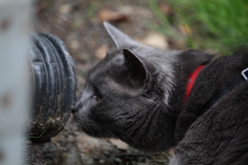 Hyde watching a chipmunk that was trapped in the drain and kept chirping at Hyde to move... which in turn made Hyde more curious.