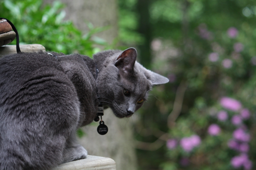 Description: Jekyll watching Hyde watch the chipmunk. Jekyll figured something was going on and heard the chipmunk chirping, decides to get a better position to watch.